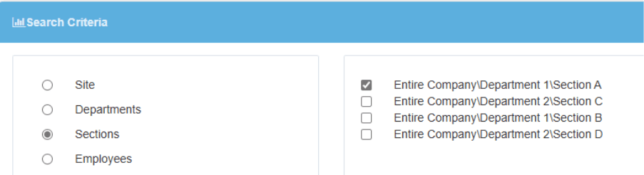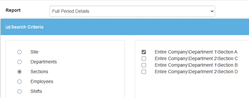 We must first choose which of these we would like to create a report for. In the example below, we have chosen to select by Section, and chosen Section A of Department 1.