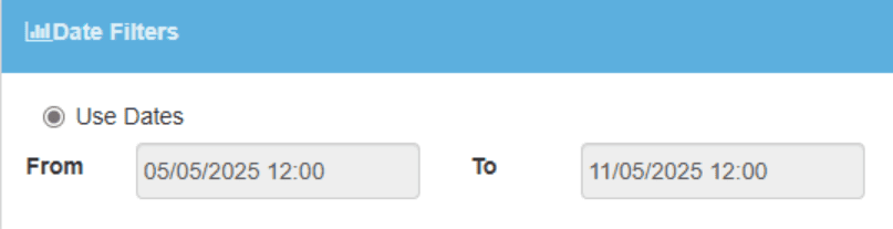 We then choose the date range- in this example, we are choosing to look at a whole week from Mon-Sun, 5/5/25 – 11/5/25. However, you can choose any date range you like, from a single day to multiple months.