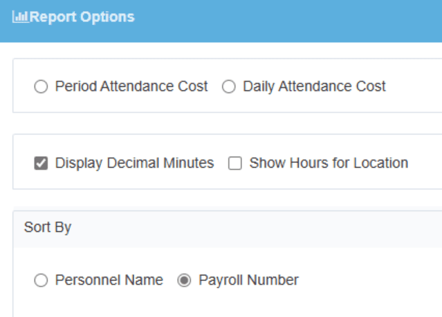 Before we generate the report, we have some other options we can choose from, such as whether we want to display decimal minutes, and if we want to sort by personnel name or payroll number.