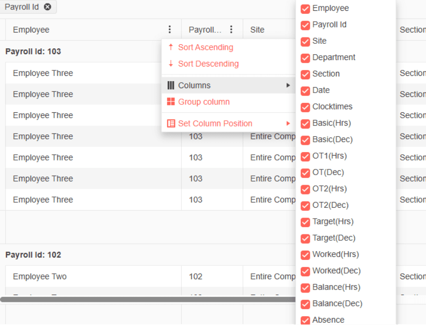 By default, the grid will arrange the data by employee payroll number. However, you can click the three dots on any column header to group the data by that column, and use the “columns” tick boxes to decide what you want it to export.
